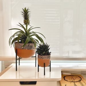 Dos Oh! Les plantes aèries amb marcs de metall negre estan elegantment suspeses d'un prestatge. Al fons es veu un vibrant calendari que mostra el mes de gener.