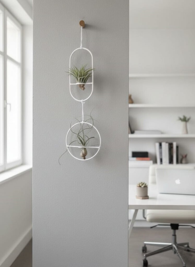 Dos ¡Oh! Las plantas aéreas con marcos de metal negro están elegantemente suspendidas de un estante. Al fondo se ve un vibrante calendario que muestra el mes de enero.